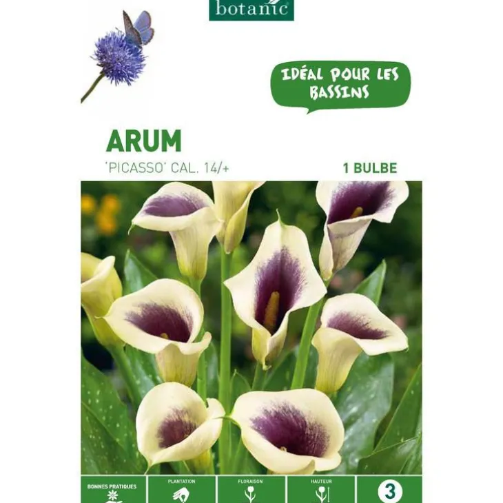 | Conseils d’entretien | N’hésitez pas à ajouter de l’engrais universel liquide pour obtenir de meilleurs résultats. Les arum sont vivaces et peuvent rester en terre dans les régions à climat doux mais redoutent les hivers rigoureux. Conservez les bulbes dans un endroit frais et sec jusqu’à la plantation.