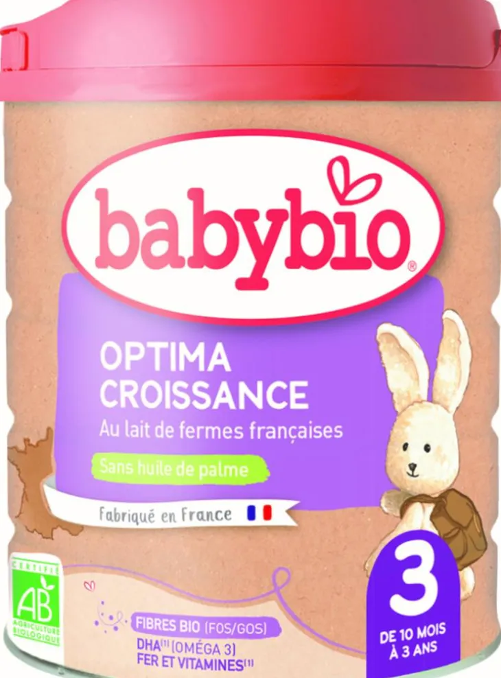 | Composition | Lait de suite biologique en poudre pour nourrissons à partir de 10 mois et aliment lacté biologique en poudre pour enfants en bas âge. Ingrédients: LAIT écrémé* maltodextrines de maïs* huiles végétales*végétales*(tournesol oléique*, colza*, tournesol*) LACTOSE* galacto oligosaccharides lait 6 7 huile de poisson (protéines de LAIT minéraux (citrate de potassium, chlorure de magnésium, chlorure de sodium, lactate ferreux, hydoxyde de potassium, sulfate de zinc, sélénite de sodium, sulfate de cuivre, sulfate de manganèse, iodure de potassium) concentré de minéraux du LAIT huile de Mortierella alpina fructo oligosaccharides* 0 36 vitamines (L ascorbate de sodium, cholécalciférol, nicotinamide, acétate de rétinol, D pantothénate de calcium, D biotine, phytoménadione mononitrate de thiamine, chlorhydrate de pyridoxine, acide folique, acétate de D alpha tocophérol, DL alpha tocophérol, L ascorbyl 6 palmitate, cyanocobalamine riboflavine) L cystine L tryptophane Bifidobacterium lactis 0 05 antioxydant extrait riche en tocophérols *Ingrédients issus de l’Agriculture Biologique