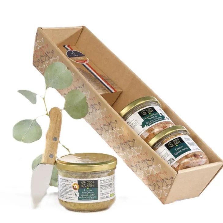 | Composition | TERRINE DE PORC AU MAGRET DE CANARD FUME : Ingrédients: viande et gras de porc (*), foies de porc (*), magrets de canard fumés* 10% (magret de canard, sel, conservateur: nitrite de sodium, antioxydant: ascorbate de sodium), graisse de canard fumée, sel, épices. *Origine France. TERRINE DE CAMPAGNE SUPERIEURE : INGREDIENTS: viande et gras de porc (*), foie de porc (*), sel, épices. (*)Origine France. RILLETTES PUR CANARD DU SUD OUEST AU FOIE DE CANARD (20% DE FOIE GRAS) : INGREDIENTS : viande de canard (origine France) 64.5% (*), foie gras de canard 20% (*), graisse de canard 14.2% (*), sel, poivre. (*) Issu d’un canard à foie gras du Sud-Ouest (Chalosse, Gascogne, gers, Landes, Périgord, Quercy)
