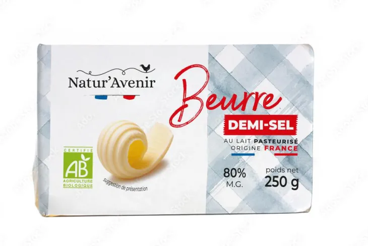 | Composition | Beurre demi-sel 80% de matière grasse issu de l’agriculture biologique Beurre [crème issue de l’agriculture biologique (lait), sel (2%), ferments lactiques (lait)]