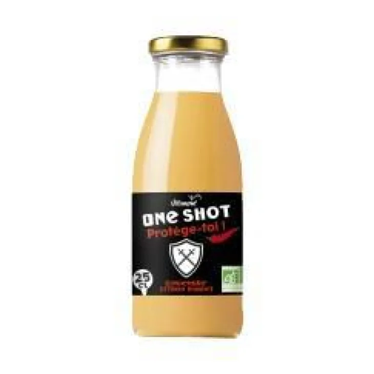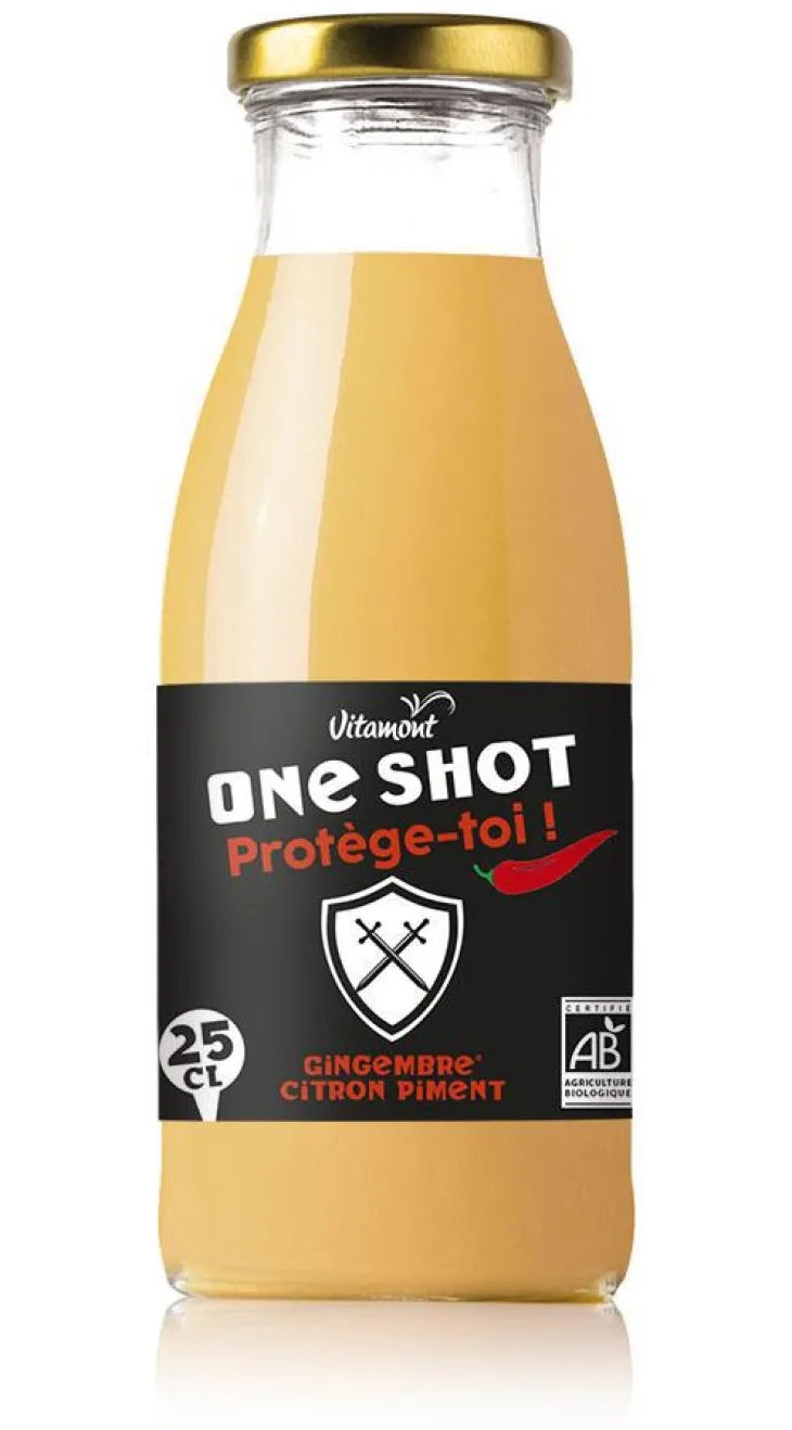 | Composition | jus d’orange* (89%), jus de gingembre* (7,5%), jus de citron*, poudre de piment de Cayenne* (0,03%).