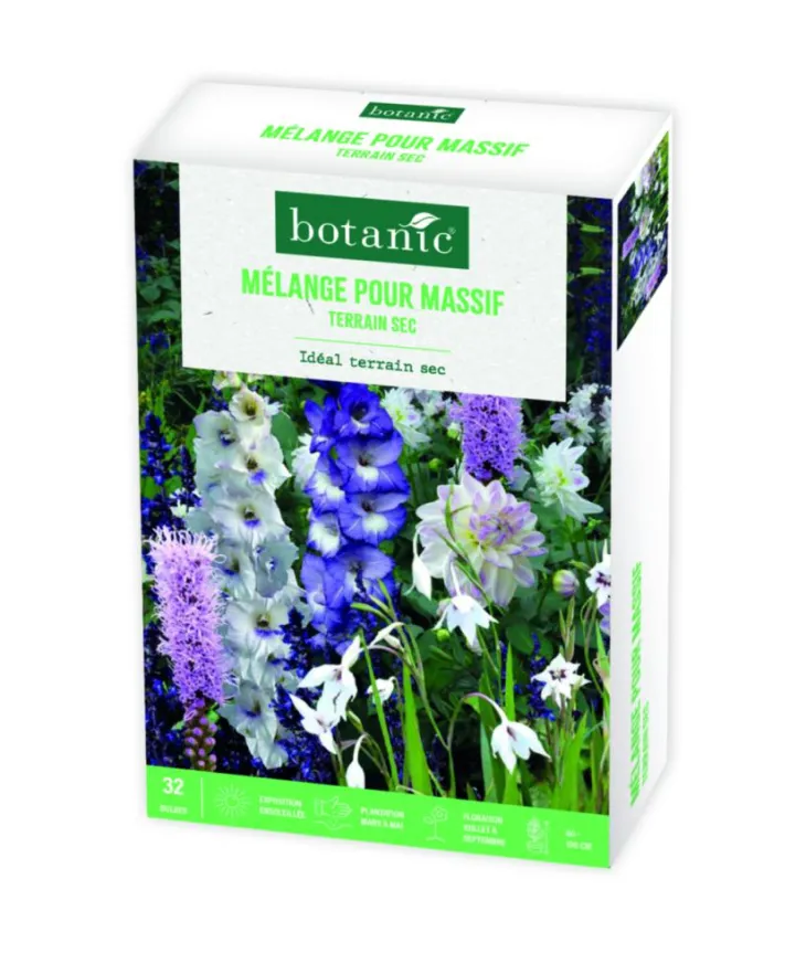 | Conseils d’entretien | Plantez les bulbes ensemble ou séparément, dans un sol riche et bien drainé, privilégier un coin ensoleillé et à l’abris du vent.- Dahlia (1 – Cal. I) : Dans un sol ameubli, placez un tuteur au centre d’une cuvette de Ø 40 cm puis le bulbe et recouvrez-le de 5 cm de terre.- Glaïeul (9 – Cal. ??) : Plantez les bulbes à environ 10 cm de profondeur et 12 cm de distance.- Glaïeul d’Abyssinie (10 – Cal. ??) : Plantez les bulbes à 10 cm de profondeur et 12 cm de distance.- Liatris (12 – Cal. ??) : Plantez les bulbes à 10 cm de profondeur et 15 cm de distance. Arrosez copieusement à la plantation puis régulièrement pendant la végétation avec une solution d’engrais, sans mouiller le feuillage. Éliminez les fleurs fanées pour prolonger la floraison.N’hésitez pas à faire des apports réguliers d’engrais universel organique liquide pour favoriser la floraison. Arrachez les bulbes de dahlias et de glaïeuls fin octobre et conservez-les dans un sec et aéré jusqu’au printemps suivant.Les lys peuvent rester en terre pendant l’hiver mais ils n’apprécient pas d’être déplacés.Les liatris peuvent rester en terre pendant l’hiver à condition de les protéger avec un paillage.