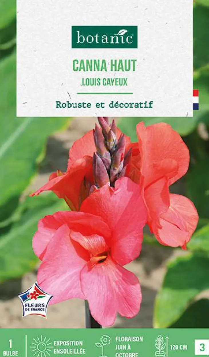 | Conseils d’entretien | Plantez en pot sous abri, dès le mois de février ou après les gelées pour une plantation en pleine terre. Pour bien se développer le canna apprécie les lieux ensoleillés et une terre riche et bien drainée. Après avoir ameubli le sol, creusez un trou de 10 cm de profond, déposez le rhizome, recouvrez-le de terre, puis arrosez. Il faut prévoir un espace de 70 cm entre chaque plante. Les rhizomes de canna ont besoin d’être arrosés plusieurs fois par semaine. Pour garantir une belle croissance,apportez de l’engrais azoté une fois par mois ou recouvrez le sol d’une couche de fumier composté ou compost au printemps. Après les premières floraisons, éliminez les fleurs fanées pour favoriser l’apparition de nouvelles fleurs. Pour les hivers doux, les cannas peuvent rester en place avec un paillage épais. Pour les hivers plus rudes, il faut extraire les souches avec la terre (pour éviter le dessèchement) et les conserver dans un endroit sec et frais avant de les remettre en terre après les dernières gelées.