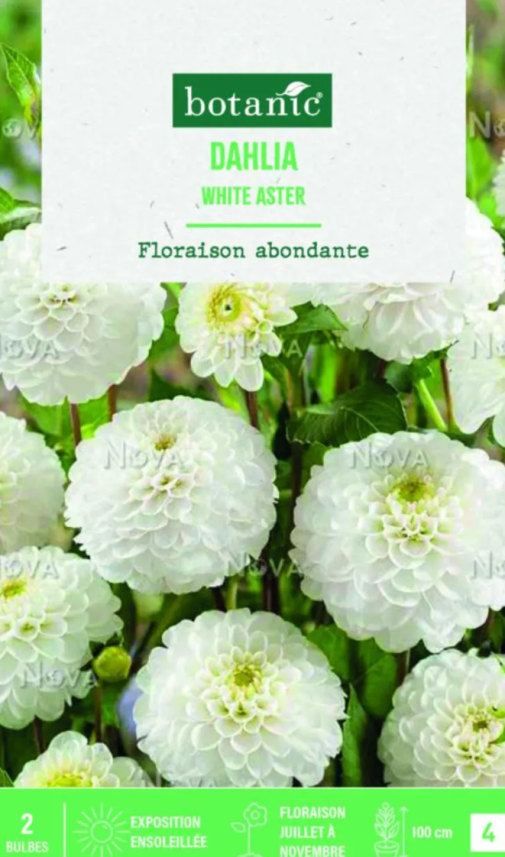 | Conseils d’entretien | Choisissez un emplacement ensoleillé dans un sol riche et bien drainé. Les bulbes de dahlias se plantent après les fortes gelées. Dans un sol ameubli, placez un tuteur au centre d’une cuvette de Ø 40 cm puis le bulbe et recouvrez-le de 5 cm de terre. Dès que la végétation s’étoffe, arrosez de préférence au pied sans mouiller le feuillage, le soir pour éviter l’évaporation. Dès le début de l’été, surveillez l’apparition de ravageurs. Arrosez copieusement à la plantation puis régulièrement pendant la végétation avec une solution d’engrais, sans mouiller le feuillage. A l’apparition des jeunes plantules, protégez des limaces et escargots. Pour des plantes plus trapues et florifères, pincez-les en début de végétation : coupez l’extrémité de la tige dès l’apparition de la quatrième feuille. Éliminez les fleurs fanées pour prolonger la floraison. Dès les premières gelées, arrachez les tubercules et remplacez-les par des bulbes à floraison printanière : tulipes, narcisses, crocus… Pailler votre sol pour le protéger et limiter le développement d’adventices. La date de floraison et hauteur varient selon le sol, l’exposition et le climat.