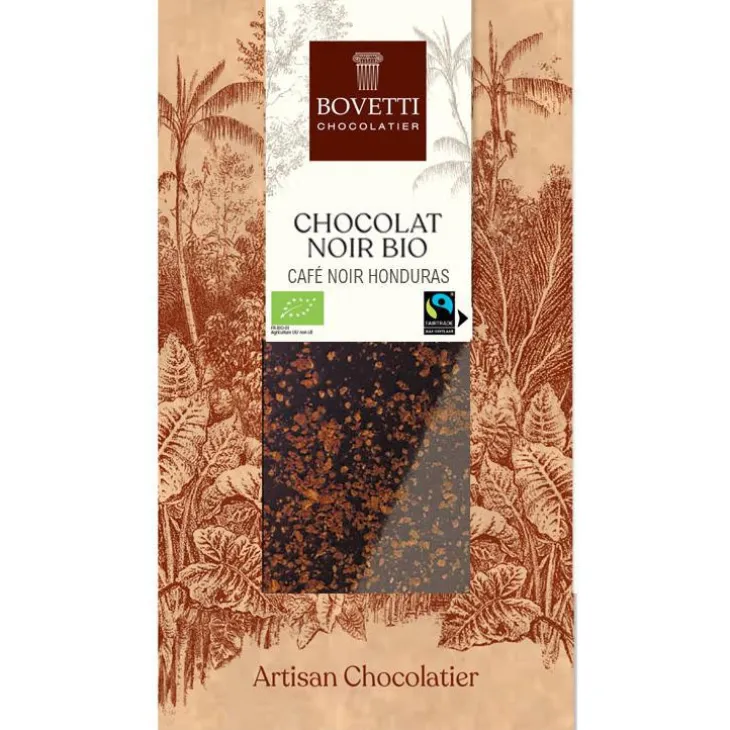 | Composition | Chocolat noir* (masse de cacao* origine St-Domingue, sucre de canne non-raffiné*, beurre de cacao*, poudre de cacao* origine St-Domingue, poudre de vanille*), café moulu* origine Honduras 2%. *issu de l’agriculture biologique