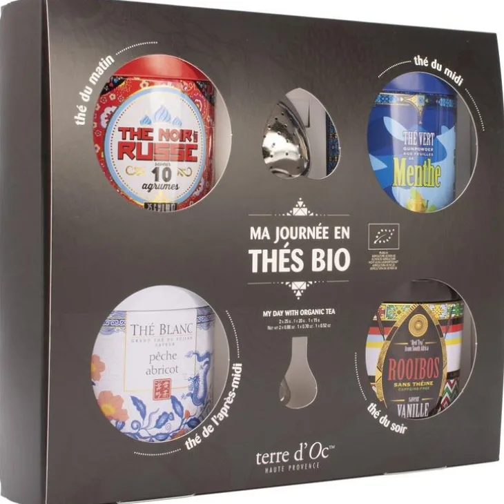 | Composition | Thé noir aux agrumes goût russe . 25?g Ingrédients?: thé noir* (Chine) 81%, cubes d’orange*, arôme naturel de bergamote*, arôme naturel de mandarine*, cubes de pamplemousse*, cubes de citron*, arôme naturel de limette*, arôme naturel d’agrumes*, arôme naturel de citron*, arôme naturel de citron vert*, arôme fleur d’oranger*. // Thé blanc saveur pêche abricot Chine 10?g Ingrédients?: Thé blanc Bai Mu Dan* (Chine) 80%, arôme naturel*, arôme naturel de pêche avec autreS arômes naturels* // Thé vert à la menthe Touareg 20?g Ingrédients?: thé vert gunpowder (Chine)* 60%, feuilles de menthe* 40%. // Rooibos saveur vanille . Afrique du Sud . 25?g INGRÉDIENTS?: Rooibos* 95% (Afrique du Sud), arôme naturel de vanille avec autres arômes naturels*.