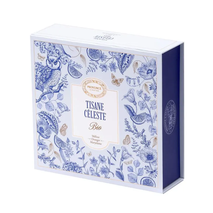 | Composition | Mélisse feuille* 35%, Pomme fruit* 32,5%, Oranger feuille* 20%, Marjolaine feuille et fleur* 6%, Arôme naturel d’orange*3,5%, Aubépine fleur* 1%, Ecorce d’orange* 1%, Bleuet* 1% – *100% des ingredients sont issus de l’agriculture biologique