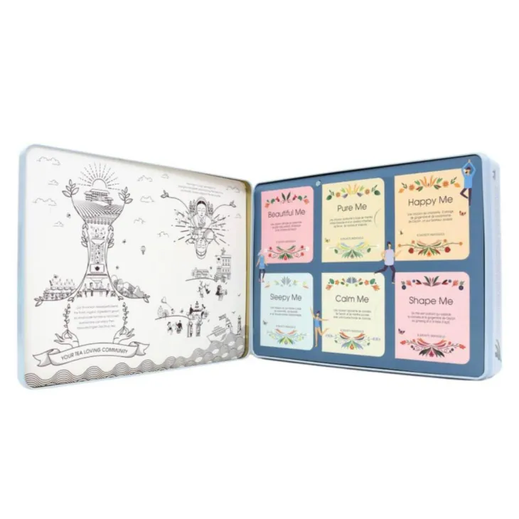 | Composition | x6 BEAUTIFUL ME – Infusion biologique de camomille, de gotu kola, d’hibiscus, de cannelle, de rooibos, de cacao, d’orange, de betterave, de cranberry et de pétales de rose. Ingrédients : camomille* (22,5%), gotu kola* (Centella asiatica) (21%), hibiscus* (16%), cannelle* (12%), rooibos* (9%), éclats de fèves de cacao* (9%), écorces d’orange* (5%), betterave* (3%), jus de cranberry* (2%), pétales de rose* (0,5%). x6 PURE ME – Infusion biologique de menthe poivrée, de menthe verte, de fenugrec, de graines de fenouil et de fleur de sureau. Ingrédients : menthe poivrée* (32%), menthe verte* (16%), fenugrec* (12%), graines de fenouil* (10%), fleurs de sureau* (8%), curcuma* (5%), écorces de citron* (5%), ortie* (4%), romarin* (3%), réglisse* (3%), souci* (2%). Contient de la réglisse. x6 HAPPY ME – Infusion biologique de citronnelle, de pomme, d’écorces d’orange et d’épices. Ingrédients : citronnelle* (34%), pomme* (22%), écorces d’orange* (14%), racine de gingembre* (12%), cardamome* (8%), coriandre* (4%), cannelle* (4%), pétales de souci* (2%). x6 SLEEPY ME – Infusion biologique de camomille, de lavande, de houblon et de valériane. Ingrédients : camomille* (62%), bourgeons de lavande* (12%), feuilles de houblon* (11%), racine de valériane* (11%), mélisse* (4%). x6 CALM ME – Infusion biologique de cannelle, de menthe poivrée, de réglisse et de lavande. Ingrédients : cannelle* (40%), menthe poivrée* (31%), réglisse* (15%), lavande* (14%). Contient de la réglisse. x6 SHAPE ME – Thé vert biologique à la cannelle, au gingembre, au ginseng et à la baie d’açaï. Ingrédients : thé vert* (54%), cannelle* (23%), gingembre* (13%), ginseng* (6%), baie d’açaï* (4%). (*) Ingrédients issus de l’agriculture biologique.