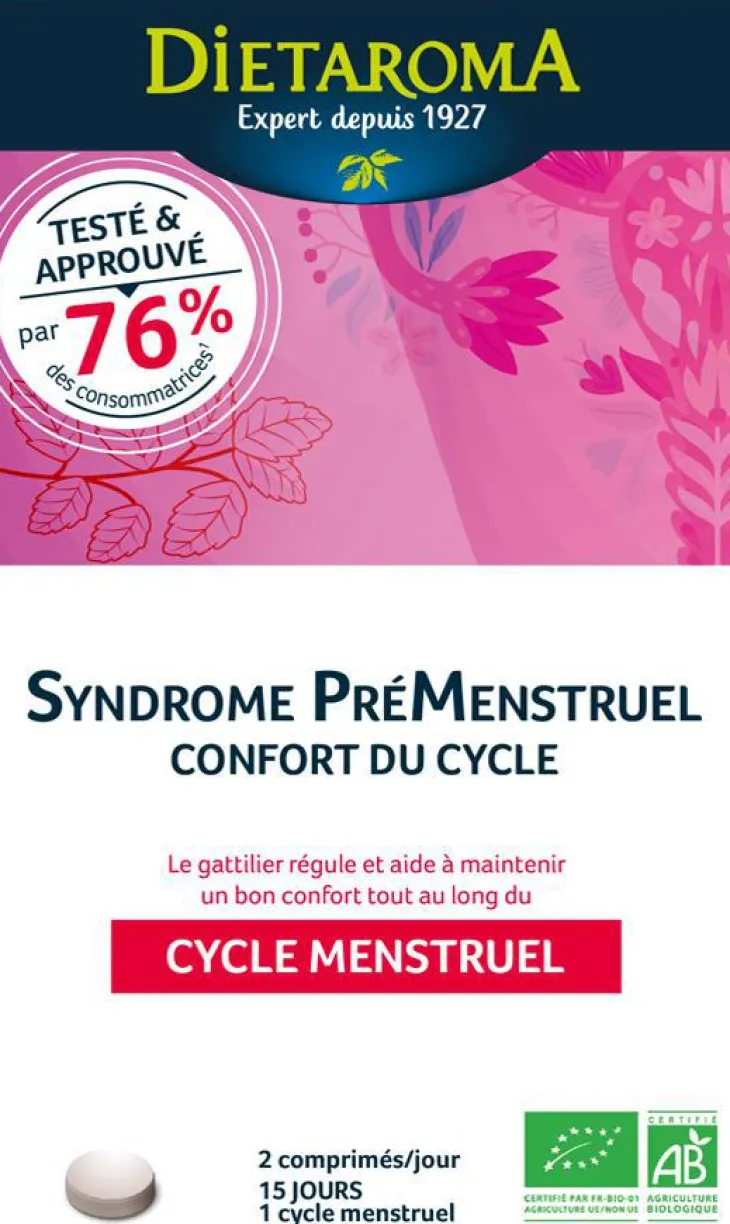 | Composition | Stabilisant : gomme arabique* ; extrait de mélisse feuille (Melissa officinalis)* ; extrait d’achillée millefeuille parties aériennes (Achillea millefolium)* ; extrait de gingembre rhizome (Zingiber officinale)* ; anti-agglomérant : carbonate de magnésium ; extrait d’alchémille des près parties aériennes (Alchemilla vulgaris)* ; extrait de pissenlit racine (Taraxacum officinale)* ; extrait de gattilier fruit (Vitex agnus castus)*.