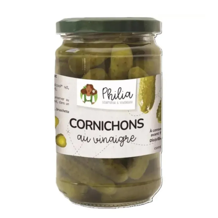 | Composition | Cornichons*, eau, vinaigre d’alcool*, sucre de canne*, sel marin, graines de MOUTARDE*, aneth*, oignons*, poivre*, poivrons*, piment*. *Ingrédients issus de l’agriculture biologique