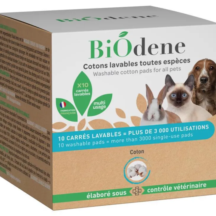 | Conseils d’entretien | Appliquer le produit sur le carré puis déposer sur l’endroit souhaité (œil, oreilles, coussinets, peau, true, bec…). Après utilisation, vous pouvez laver le coton avec le reste de votre linge, en machine à laver entre 40° et 60°, puis le laisser sécher avant de le réutiliser. Les COTONS LAVABLES BIODENE peuvent être lavés au moins 300 fois chacun.