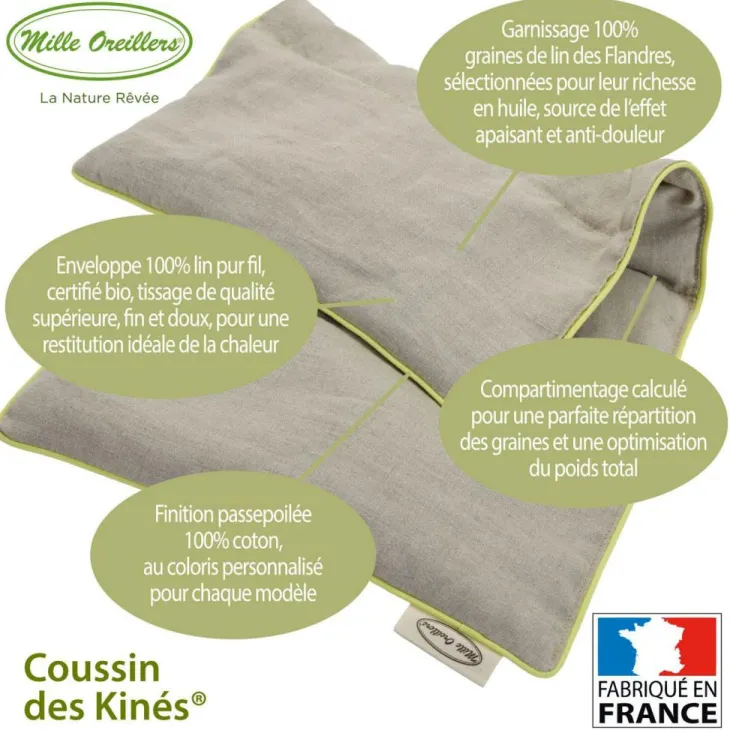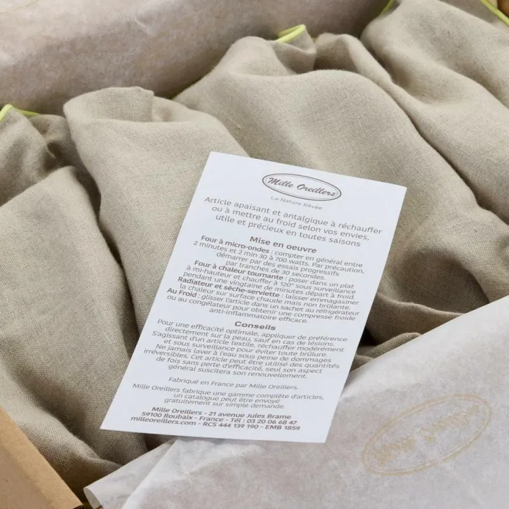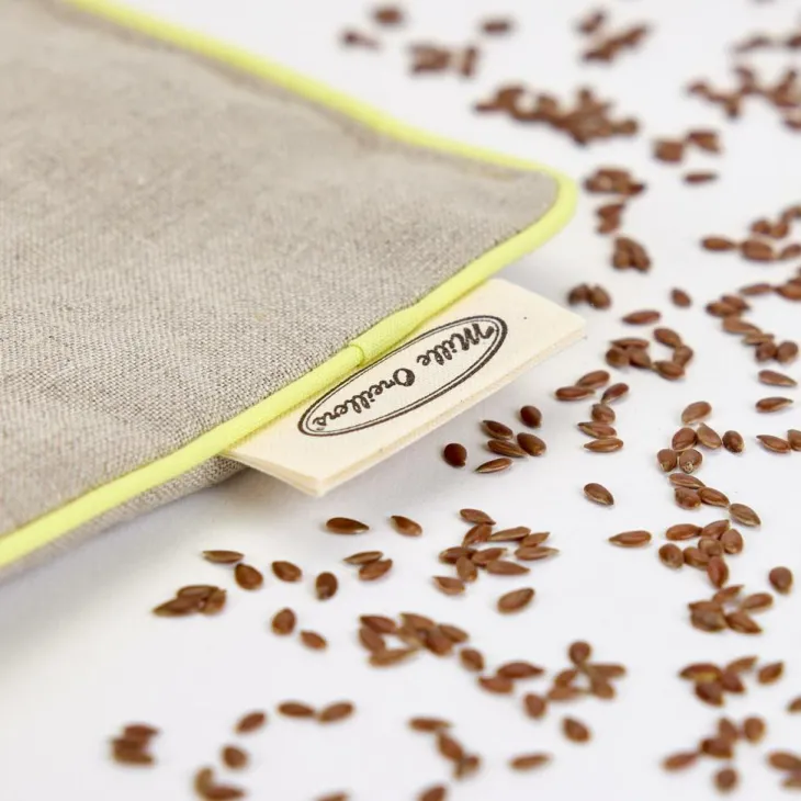 | Composition | Enveloppe 100% lin pur fil, garnissage graines de lin des Flandres
