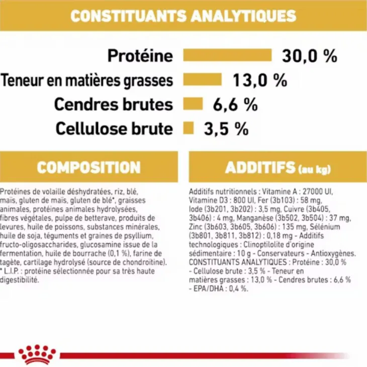 | Composition | Composition proteines de volaille deshydratees, riz, graisses animales, isolat de proteines vegetales*, maïs, pulpe de betterave, farine de maïs, hydrolysat de proteines animales, gluten de maïs, sels mineraux, huile de poisson, huile de soja, fructo-oligosaccharides (0,34 %), hydrolysat de levure (source de manno-oligo-saccharides), extraits de levure (source de beta-glucans), extrait de rose d’inde (source de luteine).