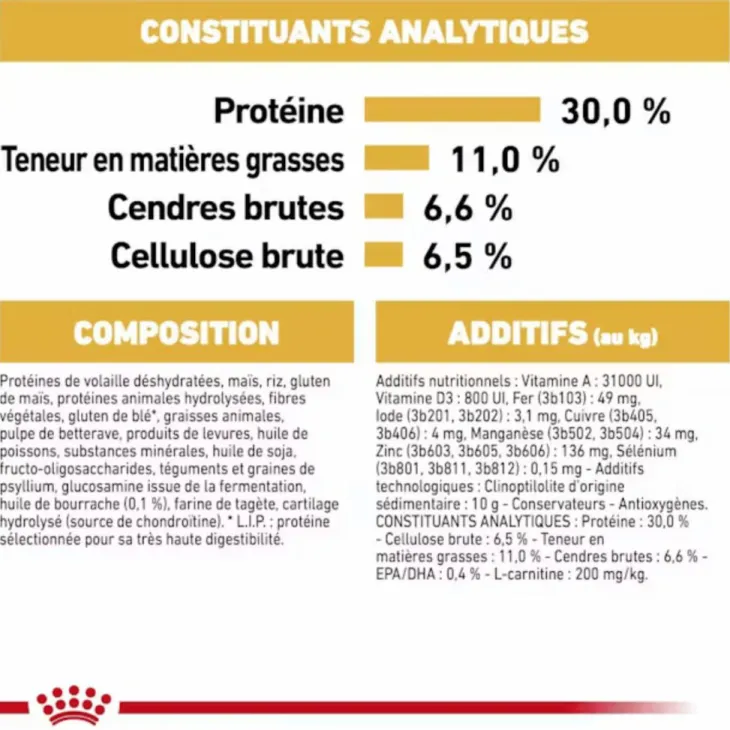 | Composition | farine de maïs, proteines de volaille deshydratees, maïs, graisses animales, orge, gluten de maïs, isolat de proteines vegetales*, hydrolysat de proteines animales, pulpe de betterave, huile de soja, huile de poisson, levures et composants de levures, sels mineraux, hydrolysat de levure (source de manno-oligo-saccharides), huile de bourrache, hydrolysat de crustaces (source de glucosamine), extrait de rose d’inde (source de luteine), hydrolysat de cartilage (source de chondroïtine).