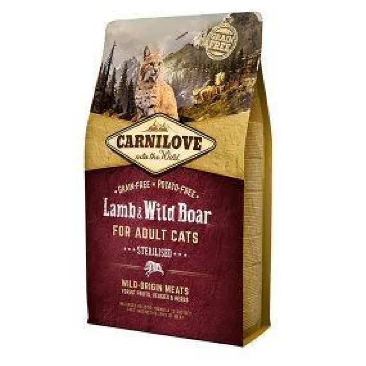 | Composition | Sanglier déshydraté moulu (35%), agneau élevé en plein air déshydraté moulu (24%), pois jaunes (19%), graisse de poulet (préservée avec de la Vitamine E, 6%), pommes (4%), foie de poulet (3%), amidons de tapioca (3%), huile de saumon (2%), carottes (1%), graines de lin (1%), pois chiches (1%), coquilles de crustacées (source de glucides, 0,026%), extrait de cartilage (source de chondroïtine 0,016%), levure de bière (source de Mannaneoligosaccharide 0,016%), racine de chicorée (source de Fructooligosaccharide, 0,012%), yucca schidigera (0,01%), algues (0,01%), psyllum (0,01%), thym (0,01%), romarin (0,01%), origan (0,01%), canneberges (0,0008%), myrtilles (0,0008%), framboises (0,0008%).