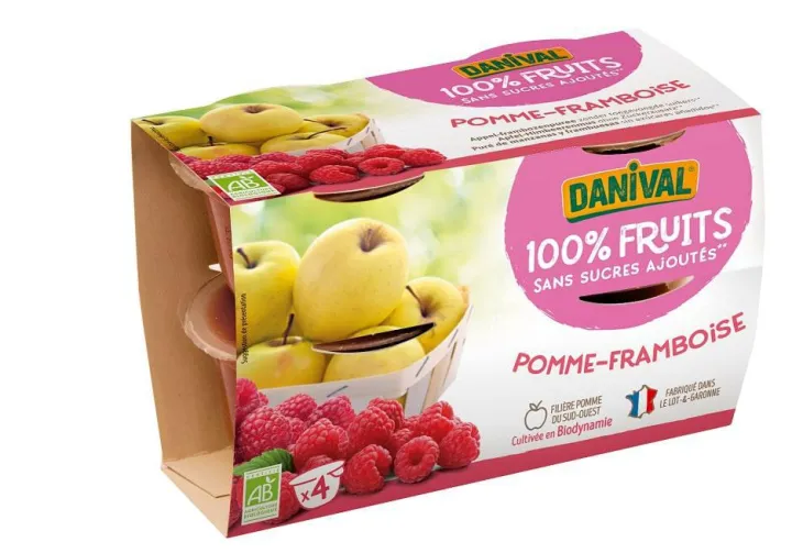 | Composition | Purée de pommes* françaises (85%), purée de framboises* (15%). * Ingrédients biologiques. ** Contient uniquement les sucres naturellement présents dans les fruits.