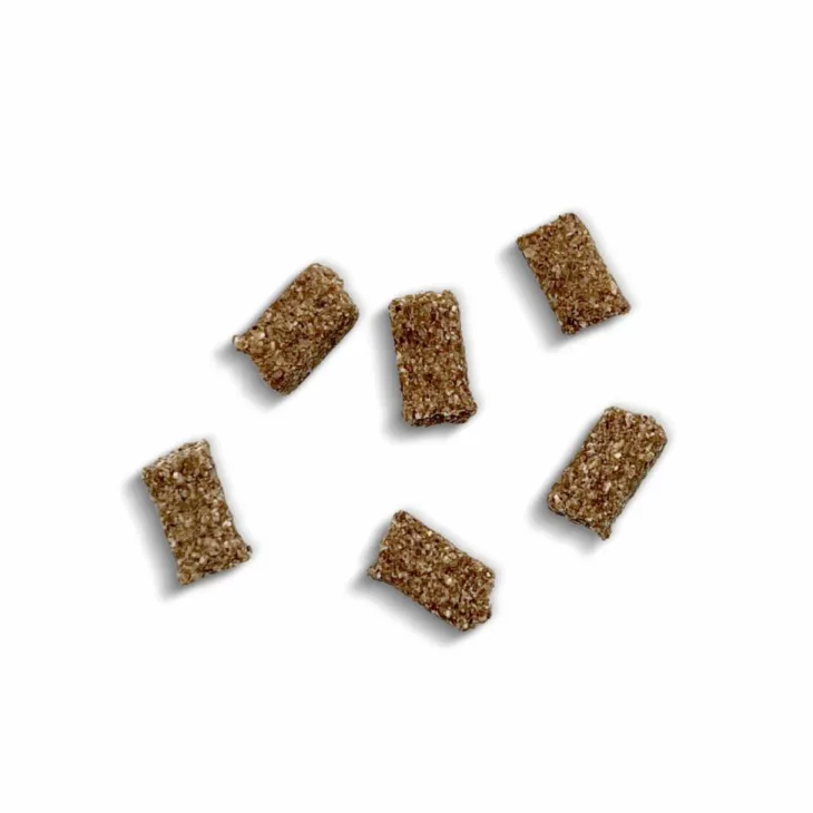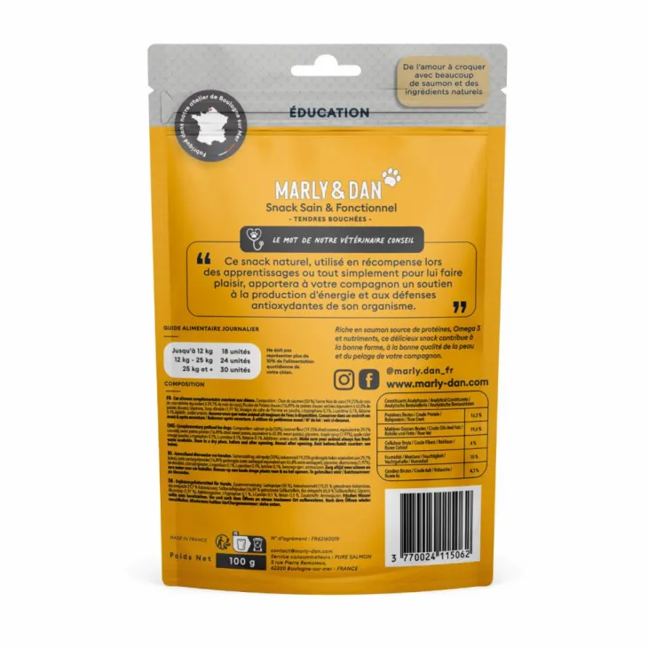 | Composition | Pulpe de saumon (50 %), Farine Noix de coco (19,25% de noix de coco séchées équivalent à 29,7% de noix de coco), Poudre de Patates douces (16,89% de patates douces séchées équivalent à 65,8% de patates douces), Glycérine, Sirop d’érable (1,97 %), Vinaigre de cidre de Pomme en poudre, L-tryptophane 0,1%, L-carnitine 0,1%, Bétaïne 0.1%. Additif : acides aminés.