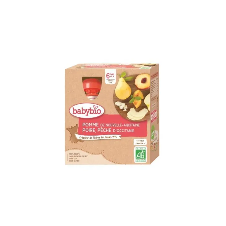 | Composition | Pommes d’Aquitaine* 50%, poires de Provence* 30%, pêches d’Occitanie* 20%. *Ingrédients issus de l’agriculture biologique.