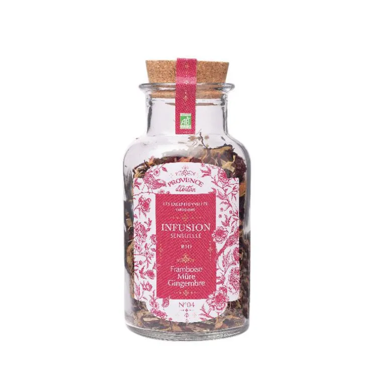 | Composition | hibiscus , gingembre, pomme, mûre, citronnelle, arome naturel de framboise bio, stevia, fleur de souci , framboise