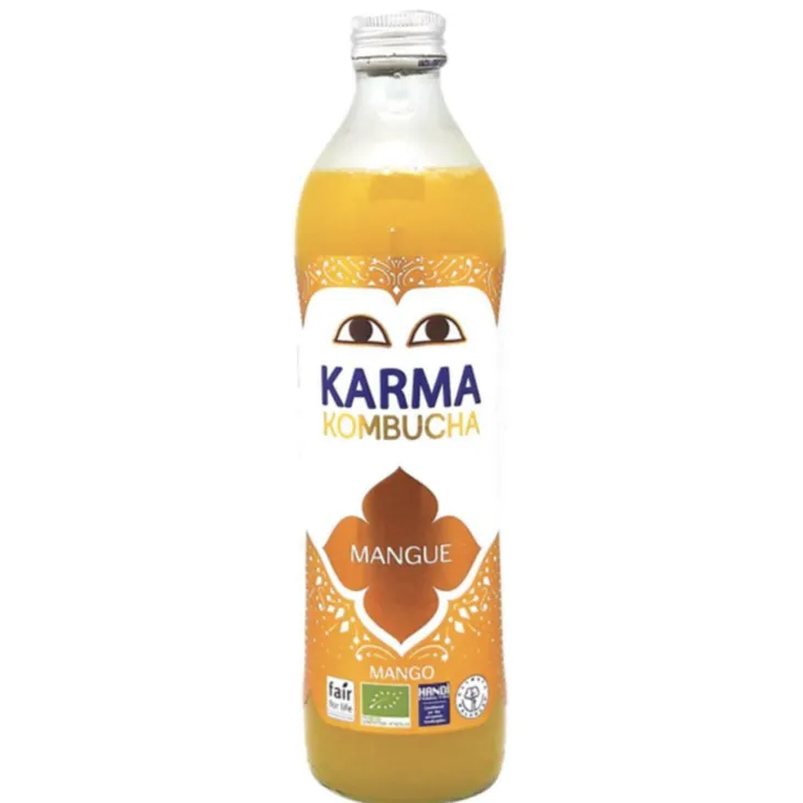 | Composition | Kombucha 95% (thé vert* (eau filtrée, thé vert Chun Mee de la région d’Hubei *), sucre de canne blond du Brésil*, culture de kombucha* (bactéries et levures)), mangue* 5%. * Ingrédients issu de l’agriculture biologique