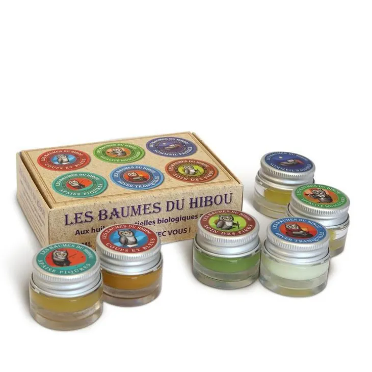 | Composition | Coups et Bleus : huile d’olive*, arnica*, huile de tournesol*, cire d’abeille, huile de Calophyllum*, cire d’olive, huiles essentielles de lavande*, de palmarosa*, de romarin*, huile essentielle de tea tree*, pigment minéral, vitamine E naturelle, molécules naturellement présentes dans les huiles essentielles Cosmétique écologique et biologique certifié par Ecocert Greenlife selon le référentiel Ecocert disponible sur http://cosmetiques.ecocert.com 100% du total des ingrédients sont d’origine naturelle 87% du total des ingrédients sont issus de l’Agriculture Biologique. Hiver Tranquille : beurre de Karité*, huile vierge de Calophyllum*, cire d’huile d’olive, huiles essentielles d’eucalyptus radiata*, de pin sylvestre*, de sapin baumier*, macérât de baies de laurier*, huiles essentielles de cajeput*, de menthe poivrée*, de romarin*, de lavandin*, de niaouli*, de cèdre*, de camphre sauvage, vitamine E, huile de tournesol, molécules naturellement présentes dans les huiles essentielles. Cosmétique écologique et biologique certifié par Ecocert Greenlife selon le référentiel Ecocert disponible sur http://cosmetiques.ecocert.com 100% du total des ingrédients sont d’origine naturelle 87% du total des ingrédients sont issus de l’Agriculture Biologique. Vitalité Musculaire : huile d’olive*, cire d’abeille, arnica*, huile de tournesol*, Helichryse*, huile de Ricin*, parfum 100% naturel, huiles essentielles de romarin*, de camphre, d’eucalyptus radiata*, de sapin baumier*, de baies de genévrier*, de mandarine verte*, vitamine E naturelle, huile de tournesol, molécules naturellement présentes dans les huiles essentielles. Cosmétique écologique et biologique certifié par Ecocert Greenlife selon le référentiel Ecocert disponible sur http://cosmetiques.ecocert.com 100% du total des ingrédients sont d’origine naturelle 88% du total des ingrédients sont issus de l’Agriculture Biologique. Soin des pieds : huile d’olive*, beurre de karité*, cire d’abeille, huile vierge de jojoba*, huile vierge de ricin*, huile vierge de calophyllum*, huiles essentielles de tea tree*, de menthe poivrée*, de romarin*, d’eucalyptus radiata*, de sapin baumier*, de gingembre*, vitamine E, molécules naturellement présentes dans les huiles essentielles. Cosmétique écologique et biologique certifié par Ecocert Greenlife selon le référentiel Ecocert disponible sur http://cosmetiques.ecocert.com 100% du total des ingrédients sont d’origine naturelle 87% du total des ingrédients sont issus de l’Agriculture Biologique. Sommeil Paisible : huile d’olive vierge extra*, cire d’abeille, huile vierge de ricin*, cire d’olive, parfum, huile essentielle de lavande*, huile essentielle de patchouli, de lemongrass*, de petit grain bigarade*, de mandarine verte*, vitamine E naturelle, huile de tournesol, molécules naturellement présentes dans les huiles essentielles. Cosmétique écologique et biologique certifié par Ecocert Greenlife selon le référentiel Ecocert disponible sur http://cosmetiques.ecocert.com 100% du total des ingrédients sont d’origine naturelle 87% du total des ingrédients sont issus de l’Agriculture Biologique. Apaise Piqûres : huile d’olive*, cire d’abeille, huile de tournesol*, calendula*, millepertuis*, huile vierge de ricin*, huile vierge de calophyllum*, huiles essentielles de lavandin*, de geranium*, de mandarine verte*, d’eucalyptus radiata*, de menthe poivrée*, vitamine E naturelle, huile de tournesol, argile rouge, molécules naturellement présentes dans les huiles essentielles. Cosmétique écologique et biologique certifié par Ecocert Greenlife selon le référentiel Ecocert disponible sur http://cosmetiques.ecocert.com 100% du total des ingrédients sont d’origine naturelle 89% du total des ingrédients sont issus de l’Agriculture Biologique.