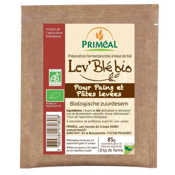 | Conseils d’entretien | Voici le secret d’une mise en oeuvre réussie :A la main: mélanger 500 g de farine + 8 g de sel + 21 g de lev’blé bio (= 2cas bombées) + environ 350ml d’eau tiède (environ 28°C). Pétrir pendant une dizaine de minutes pour obtenir une pâte souple mais non collante. Laisser reposer 30 minutes dans un saladier couvert d’un torchon humide. Reprendre le pâton en chassant légèrement l’air qui est entré pour former votre pain. Recouvrir de nouveau la pâte et la laisser poursuivre sa fermentation dans une pièce à 20°C pendant 3 heures et mettre au four chaud (220 -230 °C) pendant 45 minutes environ. En machine à pain : verser les ingrédients dans la cuve et suivre le programme pain complet (choisir le programme le plus long)