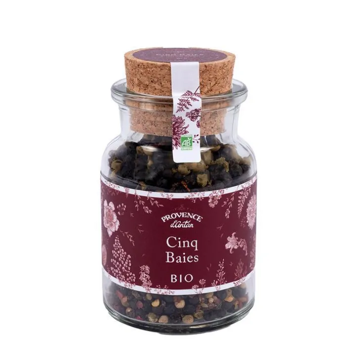 | Composition | Poivre noir bio, Poivre blanc bio, poivre vert bio, Baies roses bio, Piment Pili-pili bio