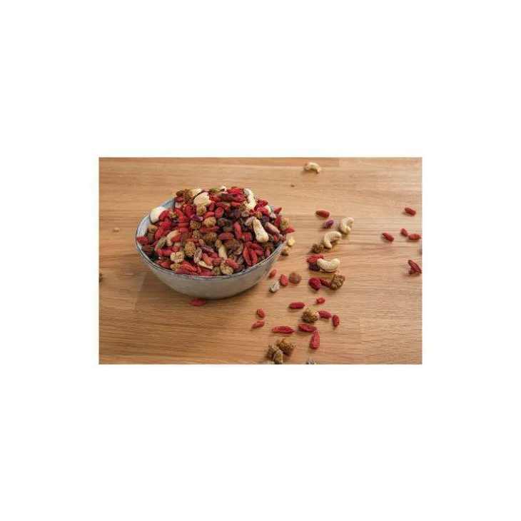| Composition | 20% raisin sultanine*(99.5% raisin*, 0.5% huile de tournesol*), 20% mulberry*, 20% noix de cajou*, 20% baies de goji*, 20% pistache décortiquée* *Issu de l’agriculture biologique Non UE