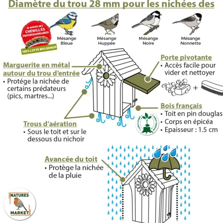 | Conseils d’entretien | Nettoyez et videz le nichoir en septembre après les nichées et février qu’il a servi pendant l’hiver et peut être souillé, afin qu’il soit propre pour les nouveaux arrivants. A sec, ou à l’eau et au savon.