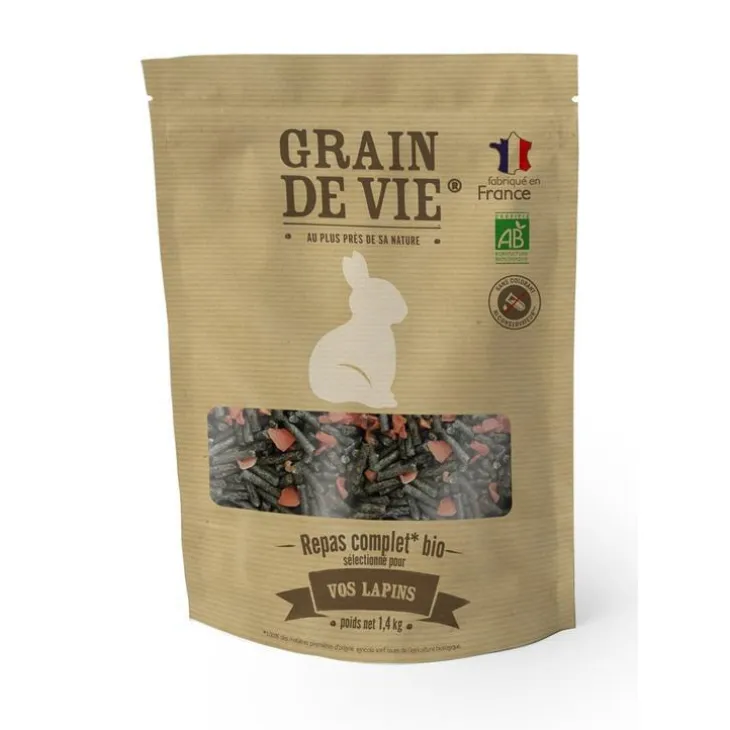 | Conseils d’entretien | Proposez quotidiennement 1 à 2 cuillères à soupe du repas complet bio aux carottes Grain de Vie dans une écuelle propre. Veillez à ce que votre lapin ait toujours de l’eau fraîche et du foin à disposition