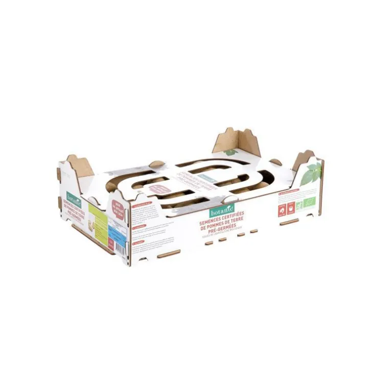 | Conseils d’entretien | A conserver au dessus de 1 C°. 1 – La préparation du sol La pomme de terre aime un sol riche, humide et bien aéré : en automne travailler le sol pour l’ameublir et apporter du fumier ou du compost. 2 – La plantation Planter dans un sol suffisamment réchauffé (10°c) dans des sillons de 5 cm de profondeur avec les distances adaptées aux variétés : Précoces : 65 cm entre les rangs, 35 cm entre les plants. Tardives : 70 cm entre les rangs, 40 cm entre les plants. 3 – La culture Il est important de butter les pommes de terre en début de végétation et continuer régulièrement jusqu’à ce que la plante ait une hauteur de 15 à 20 cm. La pomme de terre a besoin d’un climat équilibré . penser à l’arroser régulièrement, sans excès cependant. 4 – La récolte & la conservation Attendre la période de maturité complète de la pomme de terre. Etaler les tubercules dans un lieu bien aéré et sombre à l’abri du gel. Consommer les pommes de terre dans la période de conservation recommandée pour bénéficier de toutes les qualités gustatives de la variété.