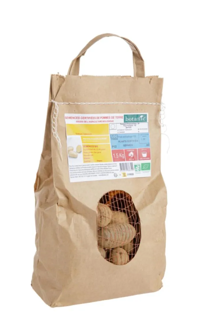 | Conseils d’entretien | A conserver au dessus de 1 C°. 1 – La préparation du sol La pomme de terre aime un sol riche, humide et bien aéré : en automne travailler le sol pour l’ameublir et apporter du fumier ou du compost. 2 – La plantation Planter dans un sol suffisamment réchauffé (10°c) dans des sillons de 5 cm de profondeur avec les distances adaptées aux variétés : Précoces : 65 cm entre les rangs, 35 cm entre les plants. Tardives : 70 cm entre les rangs, 40 cm entre les plants. 3 – La culture Il est important de butter les pommes de terre en début de végétation et continuer régulièrement jusqu’à ce que la plante ait une hauteur de 15 à 20 cm. La pomme de terre a besoin d’un climat équilibré . penser à l’arroser régulièrement, sans excès cependant. 4 – La récolte & la conservation Attendre la période de maturité complète de la pomme de terre. Etaler les tubercules dans un lieu bien aéré et sombre à l’abri du gel. Consommer les pommes de terre dans la période de conservation recommandée pour bénéficier de toutes les qualités gustatives de la variété.