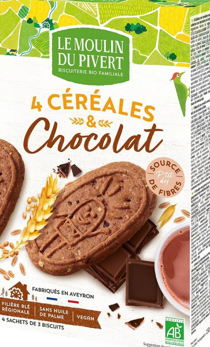 | Composition | Céréales* 52,8% (farine de blé* T65, flocons d’avoine*, farine de seigle* T130, farine d’orge*), sucre de canne non raffiné*, huile de tournesol*,pépites de chocolat* 8,8% (sucre de canne*, pâte de cacao*, beurre de cacao*, extrait de vanille*), sirop de blé*, beurre de cacao*, cacao en poudre* 2%, fibre d’avoine*, poudre à lever: bicarbonate de sodium et d’ammonium, sel de mer, jus de citron concentré*. * Produits issus de l’Agriculture Biologique