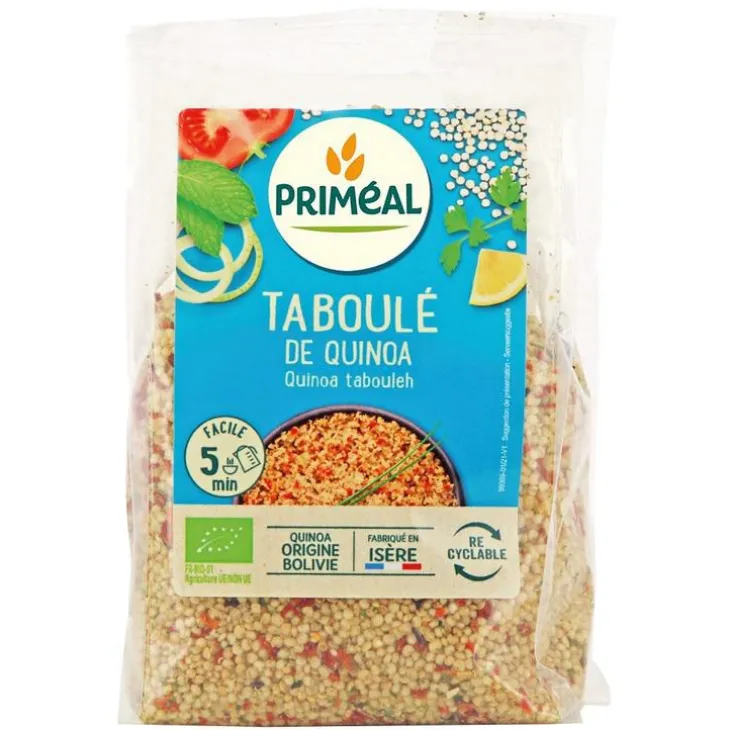 | Composition | Quinoa Real instantané* (90%), tomate*, sel marin, huile d’olive vierge extra*, oignon*, persil*, paillettes d’huile essentielle de citron* (agave*, huile essentielle de citron*), carotte*, menthe*, amidon de maïs* *issus de l’agriculture biologique