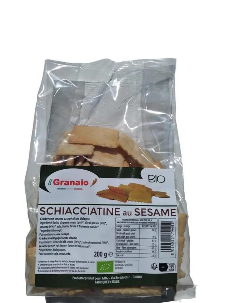 | Composition | Farine de BLE tendre*, huile de tournesol* (9%), SESAME* (4%), sel, levure, farine de BLE au malt*. *ingredients biologiques