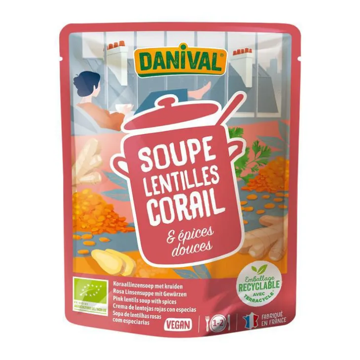 | Composition | Eau, lentilles corail, pulpe de tomates, oignons, huile de tournesol désodorisée, sel marin non raffiné de l’Atlantique, gingembre, coriandre, cardamome, carvi