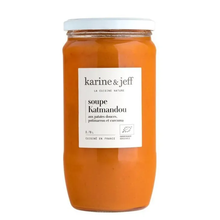 | Composition | eau pure du parc régional du Haut-Languedoc, patates douce* (19%), potimarron* (15% orig. France), poivrons rouges*, carottes* (orig. France), oignons*, sel de Guérande garanti Nature & Progrès, curcuma* (0,1%), coriandre*, piment de Cayenne*, fenugrec*, poivre*, cumin*, moutarde*, fenouil*, ail*, pois chiches*, pois cassés*