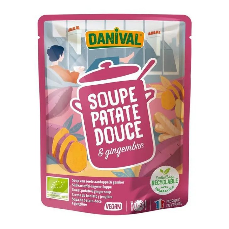 | Composition | Eau, Patate douce*16.50%,Lentilles corail*, Carotte*, Oignon*, huile de tournesol désodorisée*, Gingembre* 0.60%,Sel marin non raffiné*, Ail*,Cumin*, Poivre*0.02%.. * Ingrédients issus de l’agriculture biologique