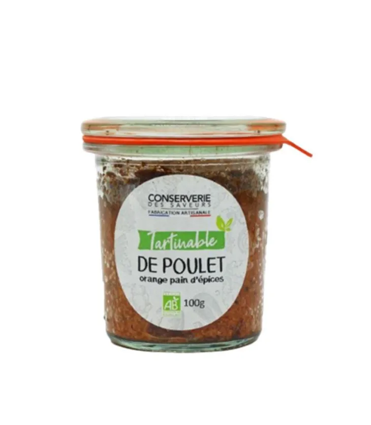 | Composition | Poulet* 50 % (origine : France), eau, carotte* , oignon* , huile de tournesol* , écorce d’orange confite* 2.5% (dont cube d’orange confite* , sucre* , sirop de glucose* , jus de citron* ) (origine : UE et non UE), sel de Guérande IGP 1.1 %, ail* , épices pain d’épices* 0.6% (origine : non UE), persil* , curcuma* , épaississant : agar-agar* , laurier* , poivre* . Traces de poissons, crustacés, mollusques, gluten, céleri, lait, oeufs et sulfites. * 100 % d’ingrédients agricoles biologiques.