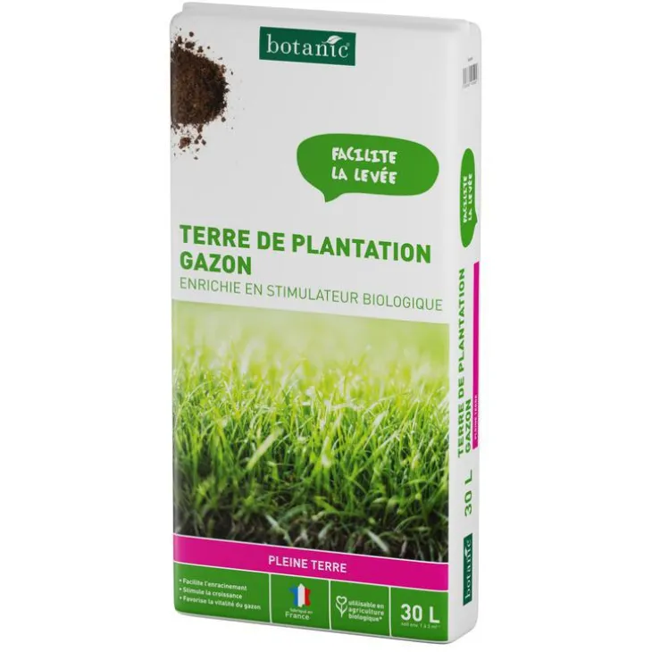 | Conseils d’entretien | Mise en place du gazonDésherber le sol et l’ameublir à la fourche de jardin. Eliminer les pierres et aplanir le sol par griffage et ratissage.Epandre une couche homogène de terre de plantation gazon botanic® de 3 cm.Procéder par semis croisé, en semant la moitié des graines dans la longueur et l’autre moitié dans la largeur.Recouvrir d’une couche fine et uniforme de terre de plantation gazon botanic®. Tasser et arroser.Regarnissage et régénération du gazon Préparer la zone à regarnir en scarifiant le sol et épandre une couche homogène de terre de plantation gazon botanic® de 1 cm.Semer de façon homogène votre gazon de regarnissage. Recouvrir d’une couche fine et uniforme de terre de plantation gazon botanic®. Tasser et arroser.En été, un paillage clairsemé facilitera le démarrage de votre semis de gazon et diminuera l’arrosage.