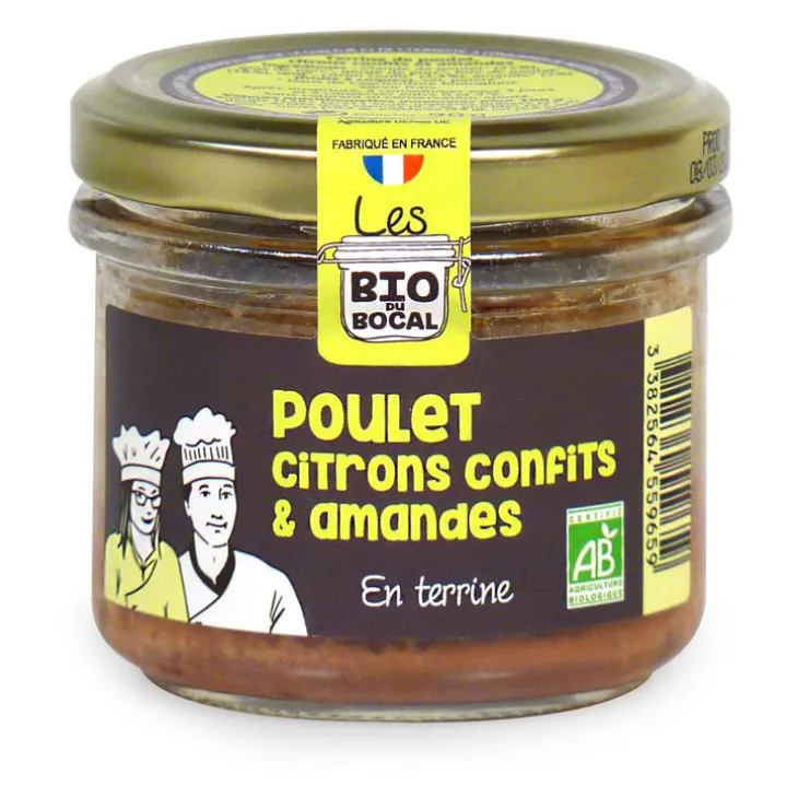 | Composition | Viande de poulet* (25%), gras de porc*, gorge de porc*, foie de poulet* (18%), œuf*, citron confit* (3,4%), AMANDE* (2%), sel, poivre*. *Issus de l’agriculture biologique.
