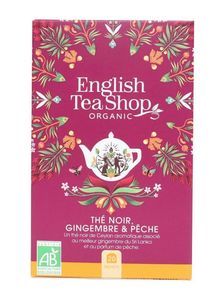 | Composition | thé noir de Ceylan* (81%), gingembre* (12%), concentré de pêche* (2%), arôme naturel de pêche (5%). (*) Ingrédients issus de l’agriculture biologique.