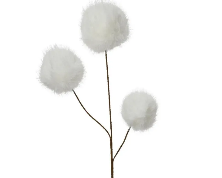 Tige artificielle avec boules duveteuses blanches en fausse fourrure – H 70 cm