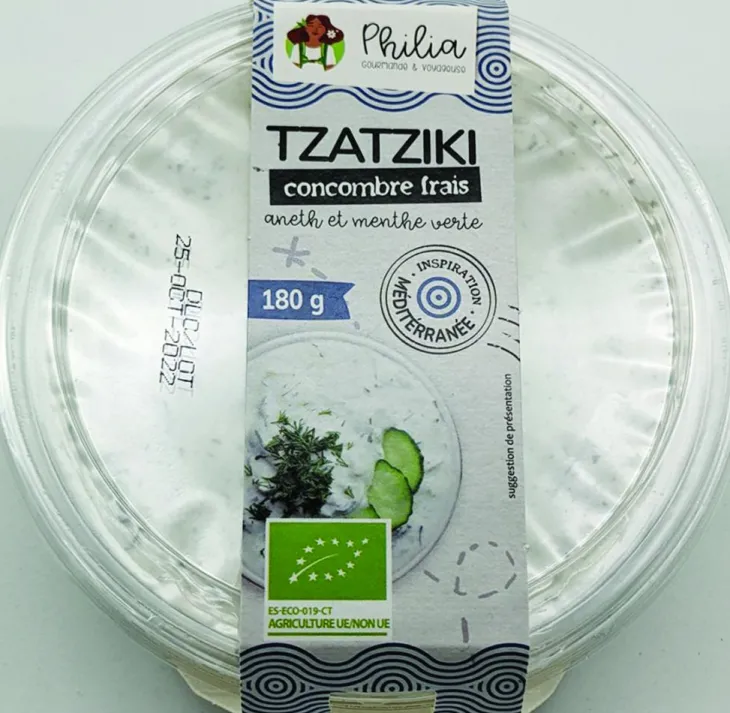 | Composition | Yaout grec* (57%) (LAIT* DE VACHE pasteurisé, CREME*, ferments LACTIQUES), concombre* (27%), eau, huile de tournesol*, menthe verte* (1.1%), huile d’olive vierge extra*, aneth* (0.8%), vinaigre d’alcool*, sel, ail en poudre*, acidifiants : acide citrique, épaississant : gomme xanthane. *Ingrédients issus de l’agriculture biologique