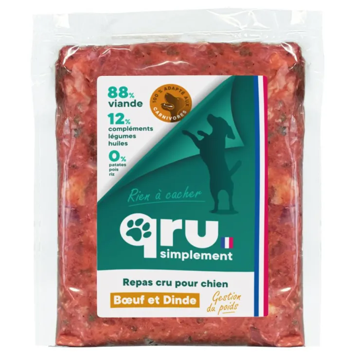 | Composition | 34% de viande de dinde, 31% d’os charnus de dinde, 17% de cœurs de dinde, 10% de légumes, 6% de foie de volaille, 2% d’un mélange complémentaire (huiles et compléments).
