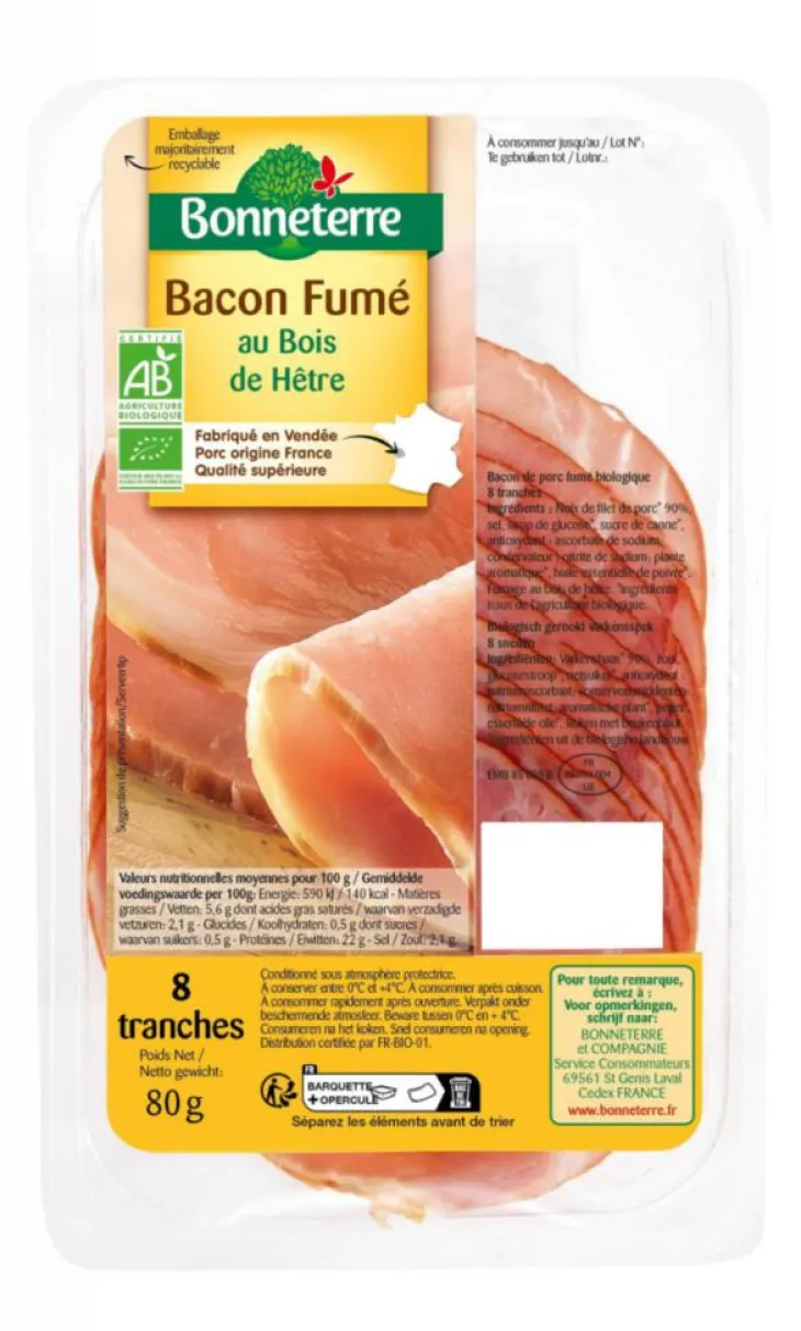 | Composition | Noix de filet de porc* 90%, sel, sirop de glucose*, sucre de canne*, antioxydant : ascorbate de sodium; conservateur : nitrite de sodium; plante aromatique*, huile essentielle de poivre*. Fumage au bois de hêtre. *Ingrédients issus de l’agriculture biologique.