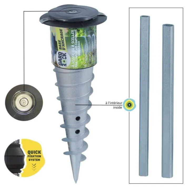 | Conseils d’entretien | Implantez des bases d’ancrage à différents endroits de votre jardin afin de moduler votre espace. Par exemple: jouer au badminton (grâce aux Poteaux Multisports Gard&Rock), vous procurer un instant de détente à l’ombre, organiser un repas ou un apéritif au cœur de votre jardin! Aussi en période hivernale, grâce à la fonction amovible, il sera beaucoup plus simple de ranger votre matériel sans contrainte de poids ni de place.Pour les petits espaces extérieurs, dans le cas notamment de maisons de ville, vous pourrez implanter une seule base d’ancrage puis ensuite alterner vos équipements. A titre d’exemple, pour venir fixer un étendoir à linge le matin, un parasol l’après-midi, puis une borne solaire Gard&Rock en soirée. Le tout par un simple clipsage au sol.Pour une intégration sur une terrasse existante ou un abord de piscine (bois, pierre, carrelage, béton,…), n’hésitez pas à consulter nos équipes pour vous apporter des solutions et conseils techniquesA coupler avec la gamme évolutive Gard&Rock : Pied pour parasol droit (428-002) / Poteaux Multisports (428-003) / Borne solaire (428-005) / Pied pour parasol déporté (428-007) / Mât pour voile d’ombrage (428-011) / Poteau pour Hamac (428-014)