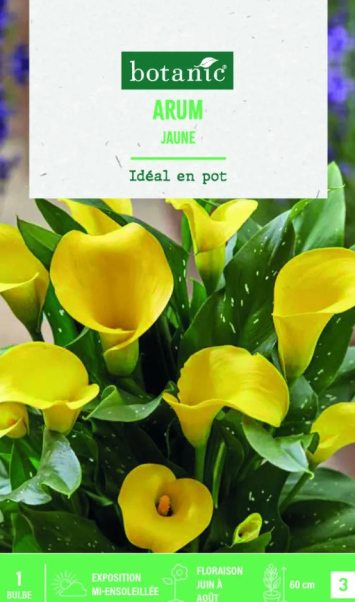 | Conseils d’entretien | Plantez les bulbes à environ 10 cm de profondeur et 40 cm de distance, à mi-ombre, dans un endroit chaud et humide à la fois, au bord d’un bassin par exemple. Arrosez abondamment pendant la végétation puis parcimonieusement pendant la période de floraison. N’hésitez pas à faire des apports réguliers d’engrais universel organique liquide pour favoriser la floraison. Pour les hivers doux, les arums peuvent rester en place. Pour les hivers plus rudes, arrachez les bulbes après floraison, faites-les sécher et conservez-les dans un endroit frais et sec pour les replanter au printemps suivant. La date de floraison et hauteur varient selon le sol, l’exposition et le climat.