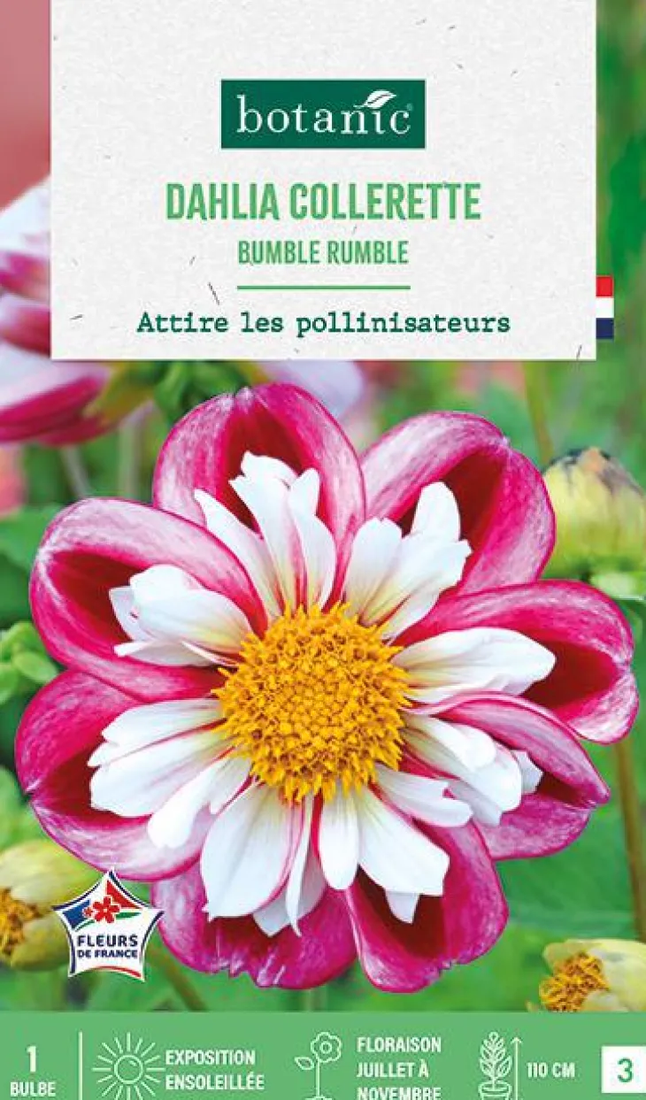 | Conseils d’entretien | Choisissez un emplacement ensoleillé dans un sol riche et bien drainé. Les bulbes de dahlias se plantent après les fortes gelées. Dans un sol ameubli, placez un tuteur au centre d’une cuvette de Ø 40 cm puis le bulbe et recouvrez-le de 5 cm de terre. Dès que la végétation s’étoffe, arrosez de préférence au pied sans mouiller le feuillage, le soir pour éviter l’évaporation. Dès le début de l’été, surveillez l’apparition de ravageurs. Arrosez copieusement à la plantation puis régulièrement pendant la végétation avec une solution d’engrais, sans mouiller le feuillage. A l’apparition des jeunes plantules, protégez des limaces et escargots. Pour des plantes plus trapues et florifères, pincez-les en début de végétation : coupez l’extrémité de la tige dès l’apparition de la quatrième feuille. Éliminez les fleurs fanées pour prolonger la floraison. Dès les premières gelées, arrachez les tubercules et remplacez-les par des bulbes à floraison printanière : tulipes, narcisses, crocus… Pailler votre sol pour le protéger et limiter le développement d’adventices.