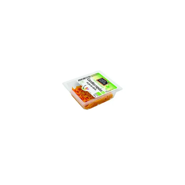 | Composition | Carotte* 77%, vinaigrette* (huile de tournesol*, eau, vinaigre d’alcool*, MOUTARDE* [vinaigre d’alcool*, graines de MOUTARDE*, eau, sel], sel, épaississants : gomme xanthane – gomme guar*), jus de citron* 1%. * Ingrédients issus de l’agriculture biologique